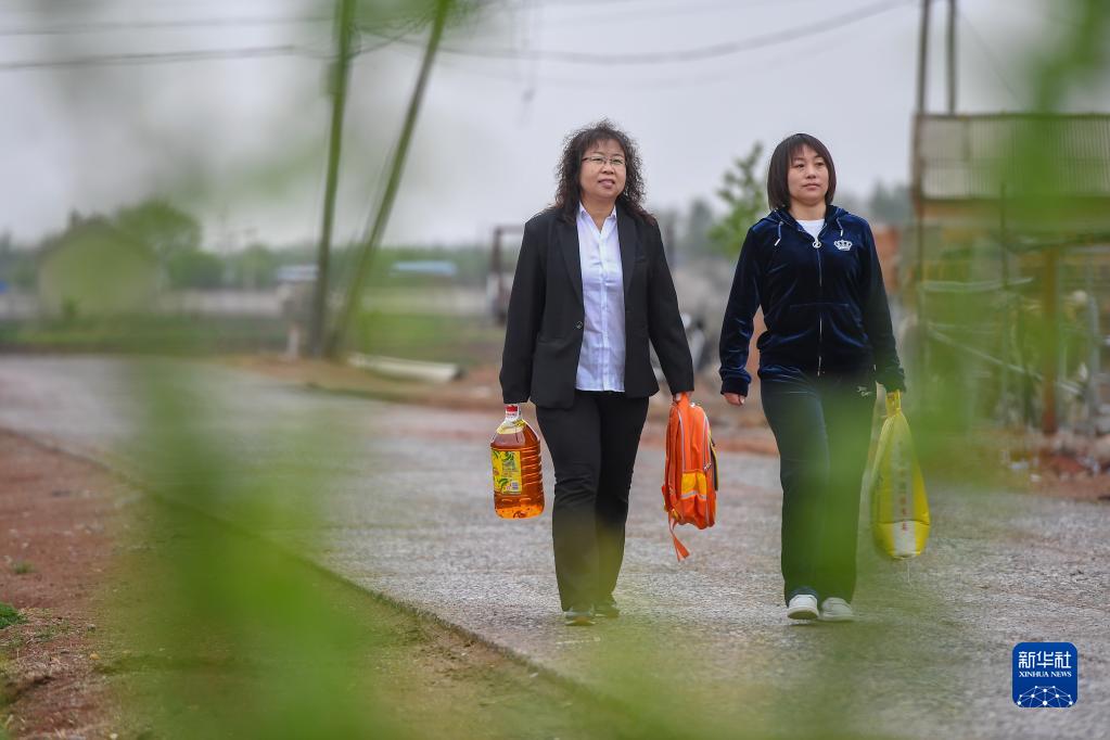 5月17日,在四平市鐵西區小泉眼村,四平市聾啞學校特教教師楊麗平(左)和同事袁麗君提著學習用品和慰問品走在“送教上門”的路上。