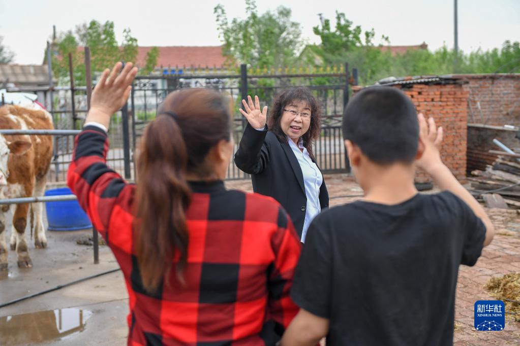 5月17日,在四平市鐵西區(qū)小泉眼村,四平市聾啞學(xué)校特教教師楊麗平(中)完成教學(xué)工作后,與學(xué)生徐鶴航(右)和徐鶴航的媽媽告別。