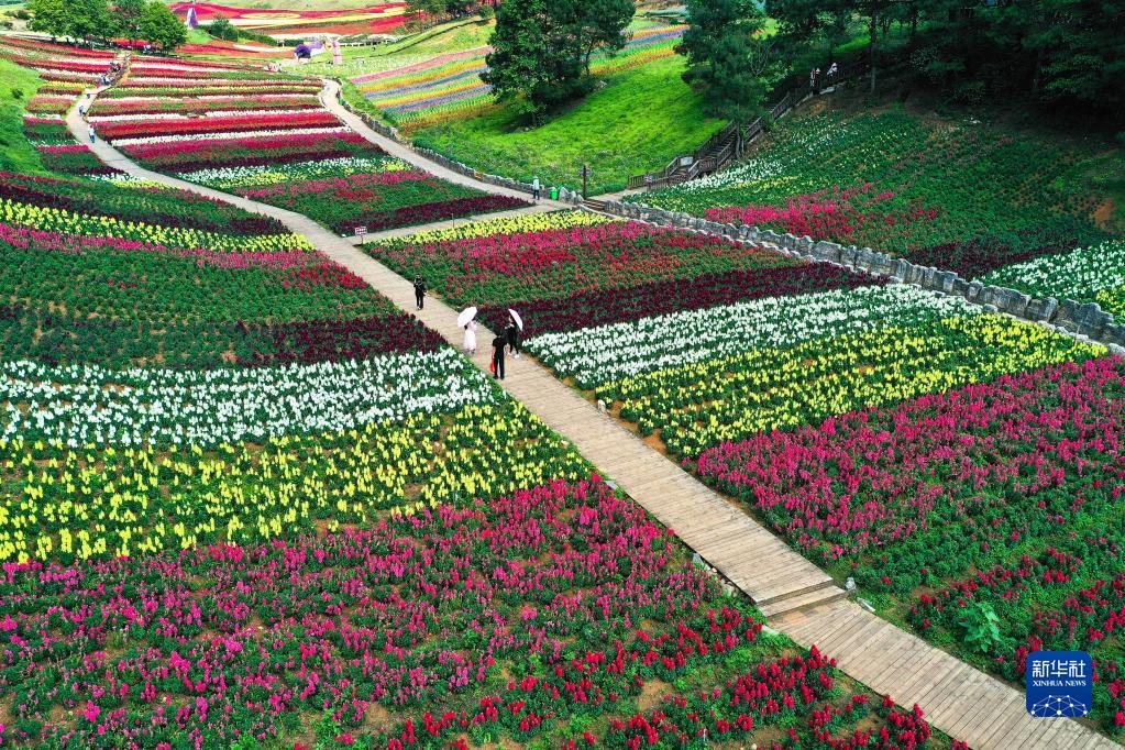 5月17日,游客在貴州省麻江縣宣威鎮(zhèn)藥谷江村賞花(無人機(jī)照片)。