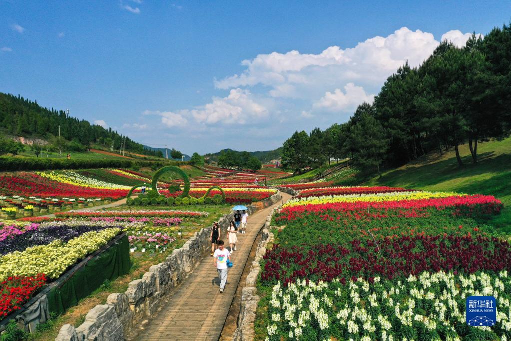 5月17日,游客在貴州省麻江縣宣威鎮(zhèn)藥谷江村賞花(無人機照片)。