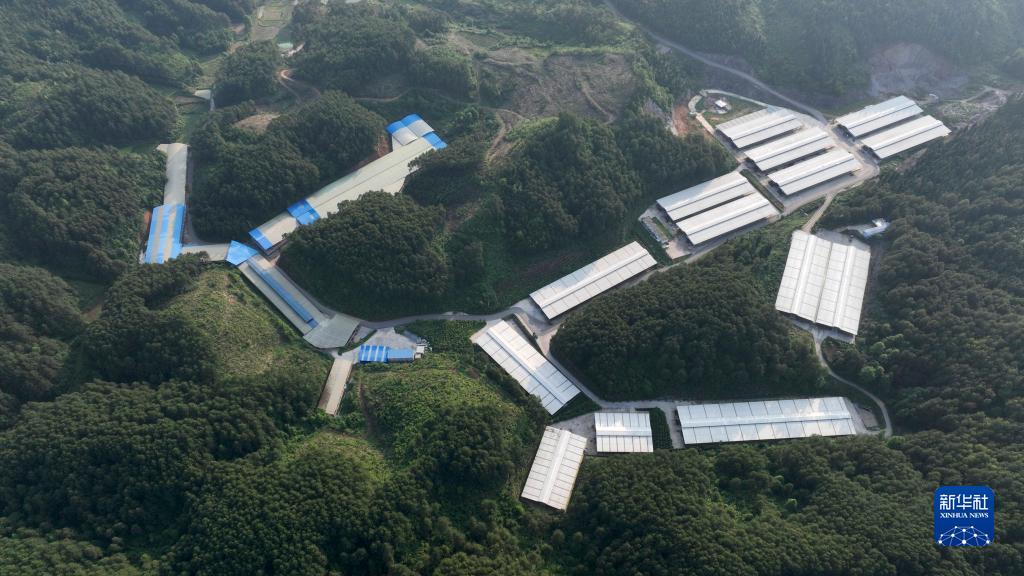 坐落在貴州省黔東南苗族侗族自治州黃平縣谷隴鎮崇山峻嶺中的大型肉牛養殖基地(無人機照片,5月17日攝)。