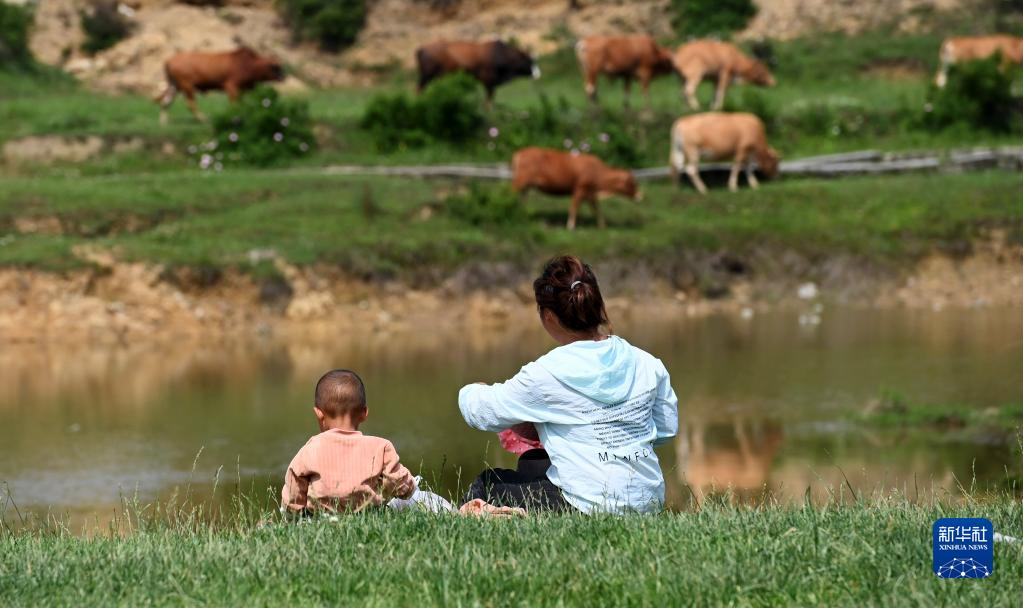 5月17日,一名村民帶著孩子在貴州省黔東南苗族侗族自治州黃平縣重安鎮(zhèn)冷坪山草場放養(yǎng)小黃牛。
