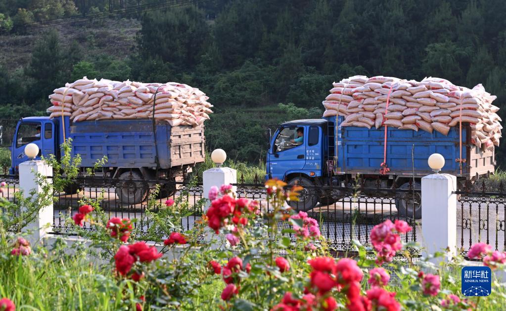 5月17日,飼料運送車輛在貴州省黔東南苗族侗族自治州黃平縣谷隴鎮肉牛養殖基地大門口排隊等候入場。