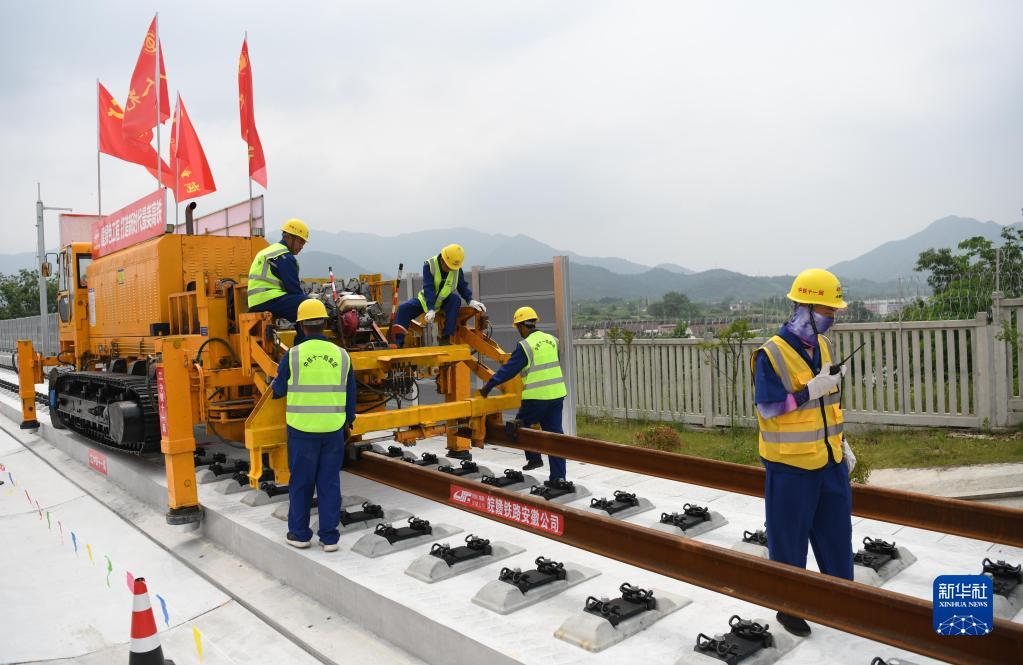 5月18日,中鐵十一局施工人員在池黃鐵路鋪軌施工現(xiàn)場作業(yè)。