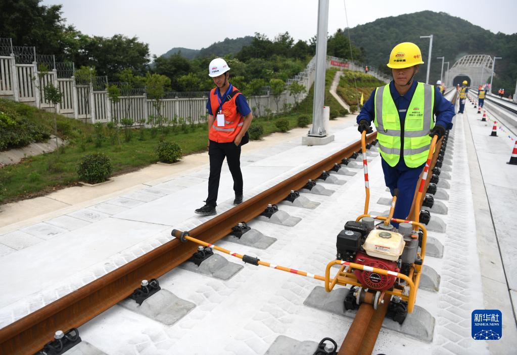 5月18日,中鐵十一局施工人員在池黃鐵路鋪軌施工現場作業。