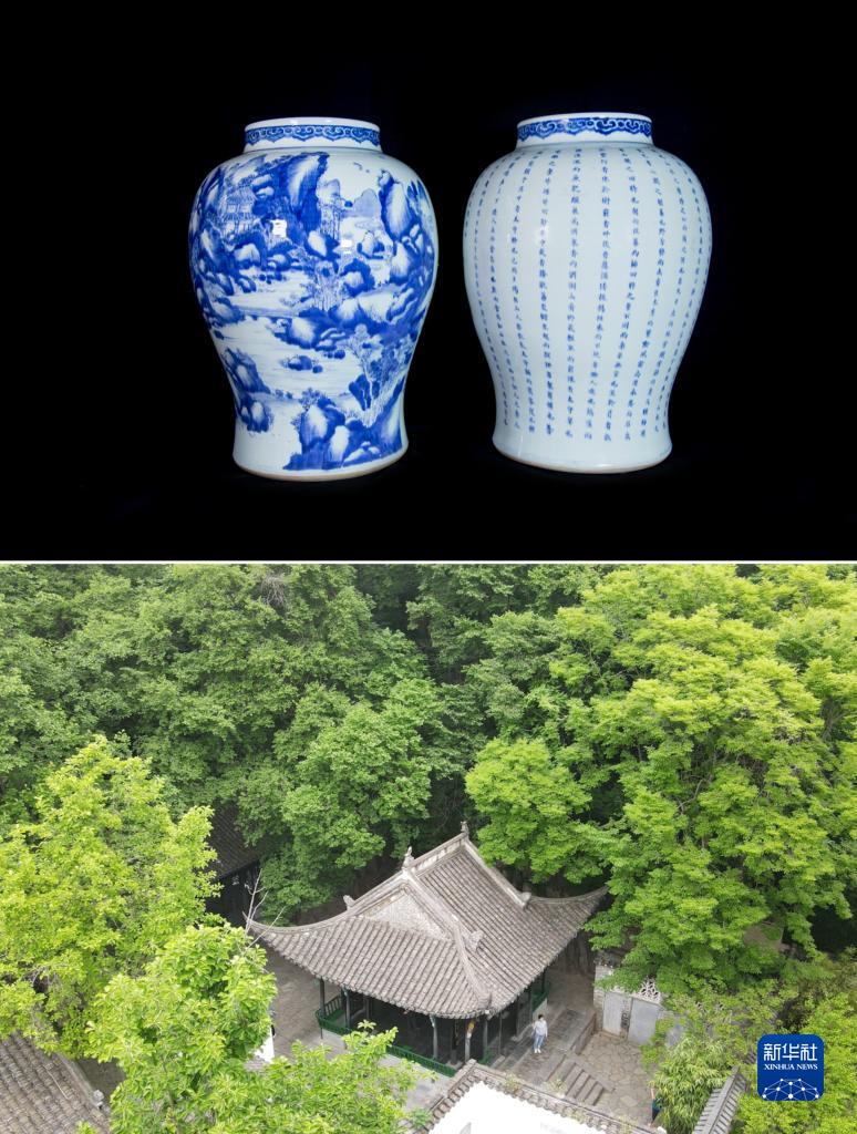 這是一張拼版照片,上圖為:《清康熙青花山水詩文大將軍罐》,文物上繪有醉翁亭主題的圖案,現收藏于滁州市博物館(滁州市博物館供圖);下圖為:5月17日拍攝的位于安徽省滁州市瑯琊山景區內的醉翁亭(無人機照片,新華社記者張端攝)。