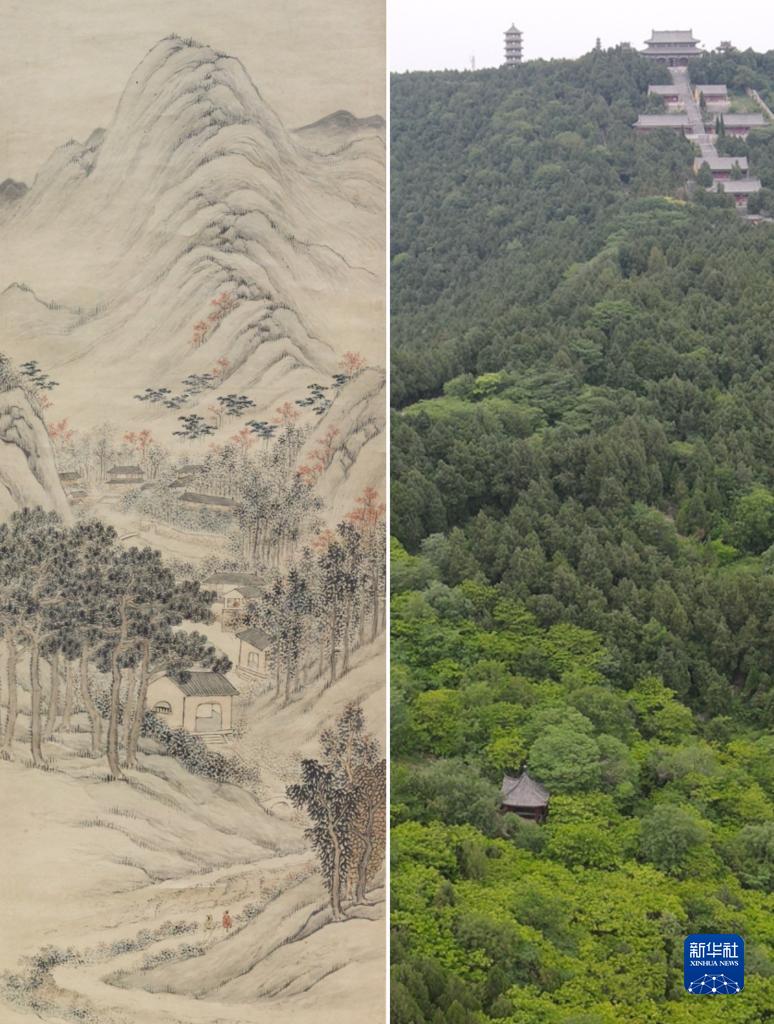 這是一張拼版照片,左圖為:《八公秋霽圖》,由清代畫家潘思牧創作,現收藏于安徽博物院(新華社發,李鵬飛 攝);右圖為:5月16日拍攝的位于安徽省淮南市壽縣的八公山風景區(無人機照片,新華社記者張端攝)。