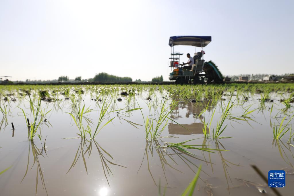 初夏時節,河北省唐山市豐南區水稻種植區的農民搶抓農時,開展水稻插秧工作,田間呈現出一派繁忙景象。