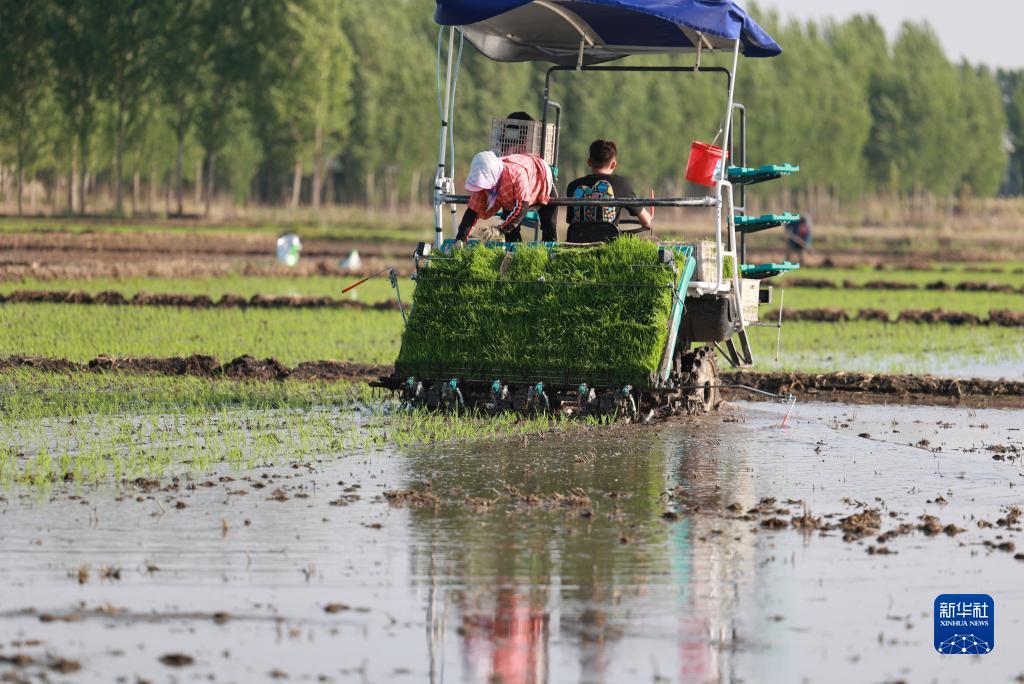 5月18日,河北唐山豐南區(qū)岔河鎮(zhèn)楊義口頭一村農(nóng)民在水稻田使用農(nóng)機(jī)插秧。