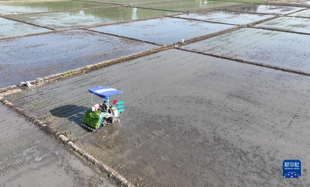 5月18日,河北唐山豐南區岔河鎮楊義口頭一村農民在水稻田使用農機插秧(無人機照片)。