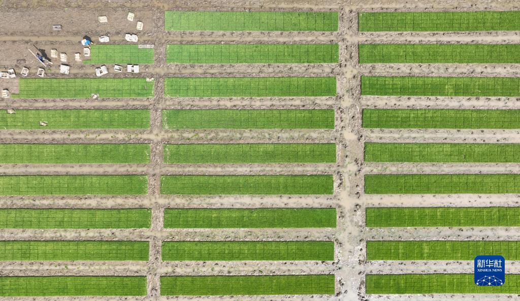 5月18日,河北唐山豐南區(qū)岔河鎮(zhèn)楊義口頭一村農(nóng)民在水稻秧苗田起秧(無人機(jī)照片)。