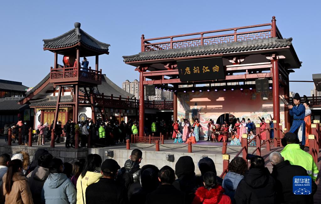 西安大唐芙蓉園內(nèi)的西安鼓樂演出(1月24日攝)。