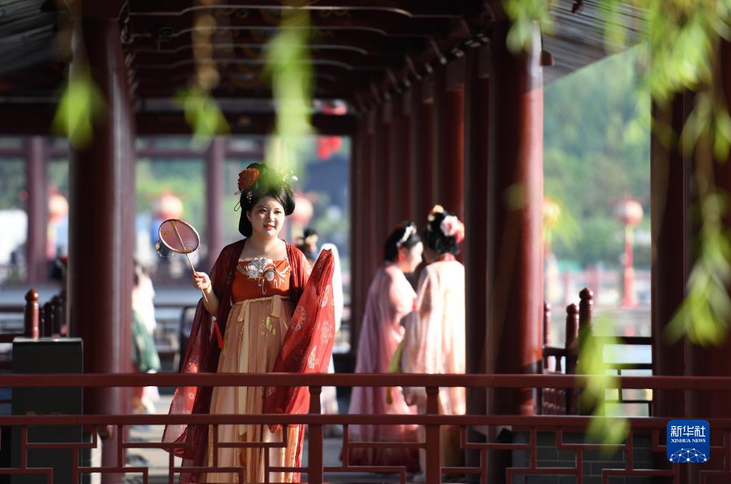 位于陜西西安城南的大唐芙蓉園,是在唐代芙蓉園遺址以北、仿照唐代皇家園林式樣重建的一座全方位展示盛唐風貌的大型文化主題遺址公園。園內紫云樓館橋飛渡,彩霞亭煙波浮動,望春閣亭亭玉立……漫步其間,隨處可見身著古裝的游客攜親友同行,在流動的光影之間,恍若穿越千年。水舞燈光秀《大唐追夢》、歌舞劇《夢回大唐》、宮廷燕樂《鼓》等創新演藝也讓唐風國韻在此散發經久不衰的藝術魅力。