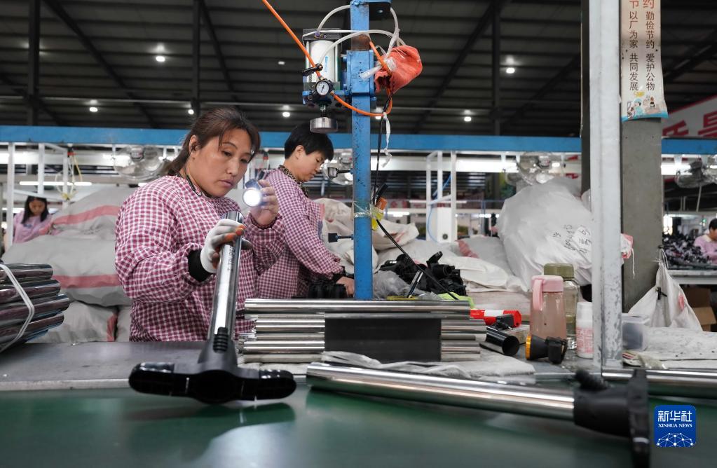 5月18日,河北省平鄉(xiāng)縣一家打氣筒生產(chǎn)企業(yè)的工人在檢查打氣筒質(zhì)量。