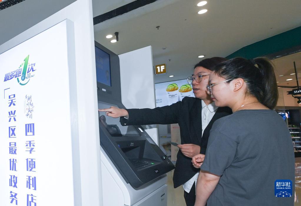 5月18日,湖州市吳興區政務辦的工作人員在開設于商場大廳中央的“夜市辦”指導市民在自助服務機上辦理事項。