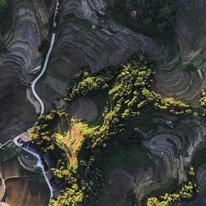 5月17日拍攝的夕陽映照下的紫鵲界梯田(無人機照片)。