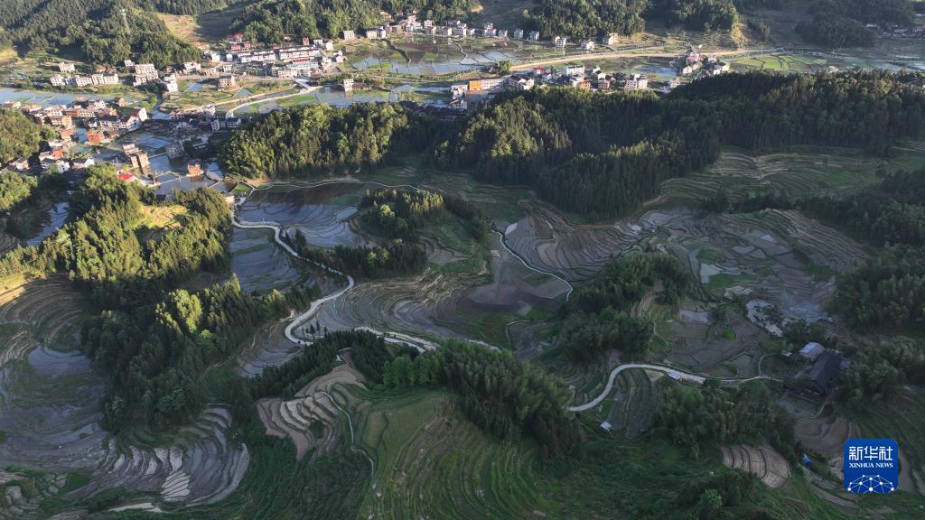 近日,湖南省婁底市新化縣紫鵲界梯田蓄水備耕,水影天光如詩如畫。