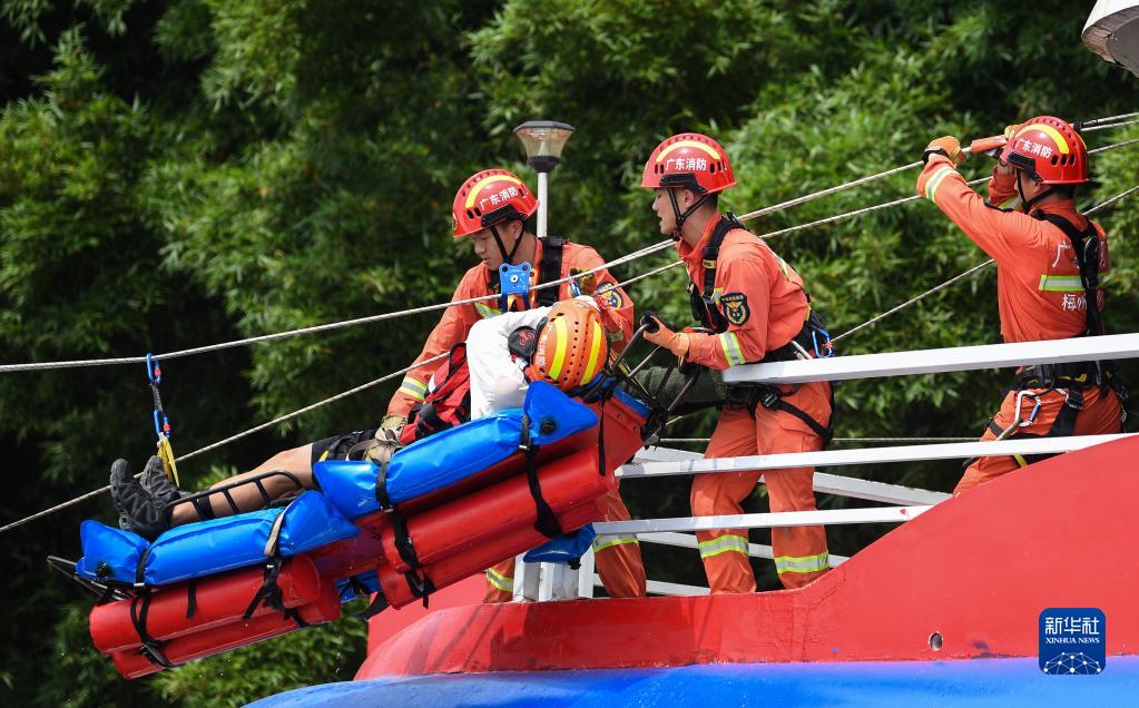 5月18日,參加演練的消防人員通過繩索和漂浮擔(dān)架營救“被困群眾”。