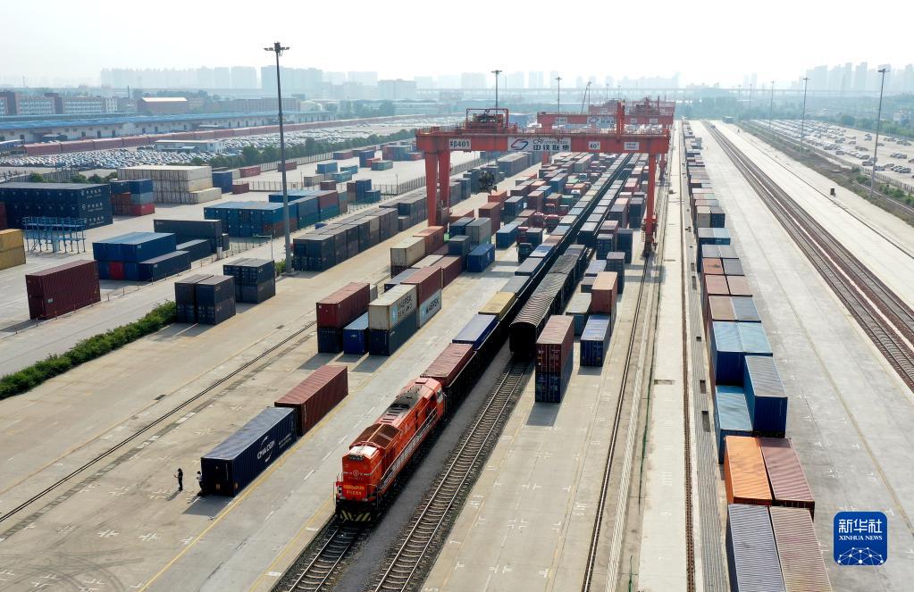 5月18日,X9021次中亞班列(鄭州)駛出中國鐵路鄭州局集團有限公司圃田車站(無人機照片)。