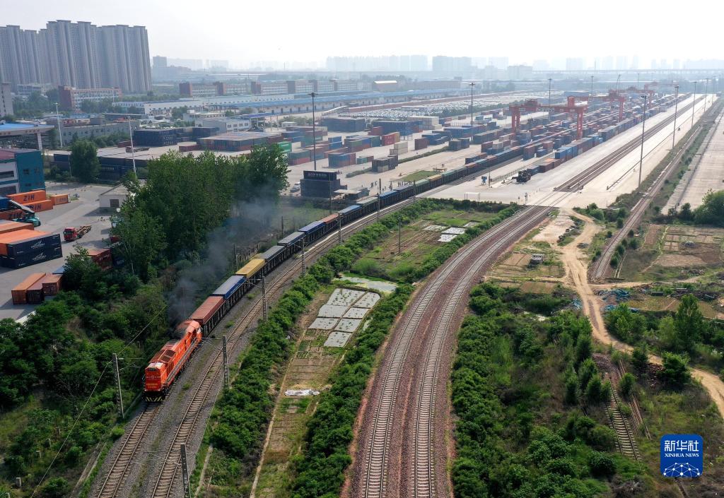 5月18日,X9021次中亞班列(鄭州)駛出中國(guó)鐵路鄭州局集團(tuán)有限公司圃田車站(無(wú)人機(jī)照片)。