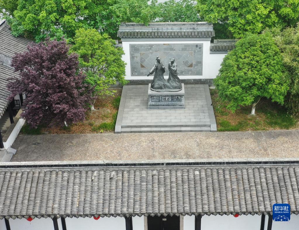在仰圣園內拍攝的徐霞客與友人木增塑像(5月16日攝,無人機照片)。