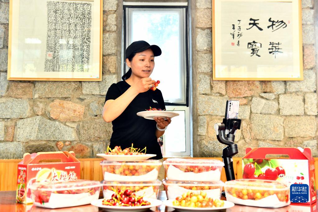 5月18日,在泰安市徂汶景區(qū)天寶鎮(zhèn)年家峪村,一位果農在直播推介櫻桃。