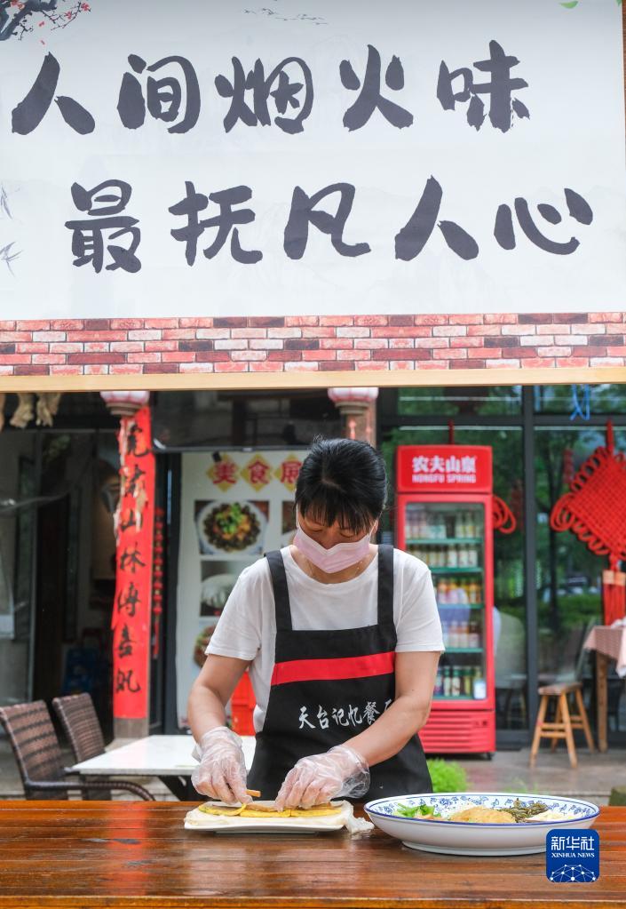 5月17日,在天臺(tái)山游客中心,天臺(tái)記憶餐廳的工作人員制作當(dāng)?shù)靥厣朗场帮滐炌病薄?/p>