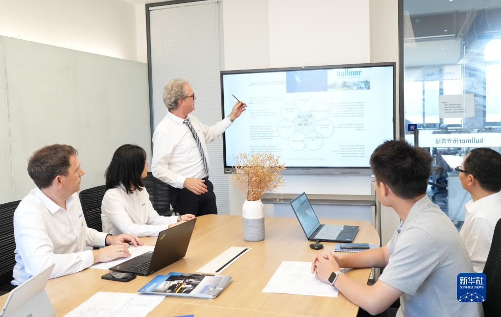 5月18日,在臨海拓卡奔馬機電科技有限公司,德方管理人員和中方團隊交流企業管理經驗。