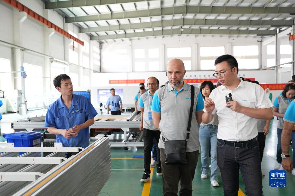 5月18日,在臨海拓卡奔馬機電科技有限公司,海外戰略經銷商代表在參觀裁床生產線。