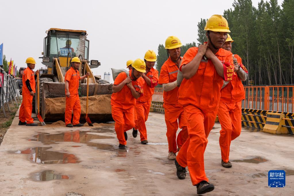 5月18日,參加演練的中鐵四局施工人員在現場搶運沙袋。