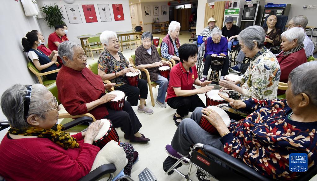 朝陽無限社區的老年人在社區養老驛站學習手鼓演奏(5月17日攝)。