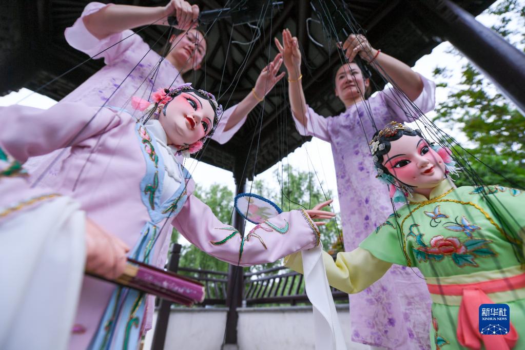 孫菁(右)和施錦芳在蘇州市吳江區七都鎮一處公園內進行排練(4月18日攝)。他們手提十多根線操縱著約六十厘米高、七八斤重的木偶,通過手指、形體動作來操控木偶的動作神態。
