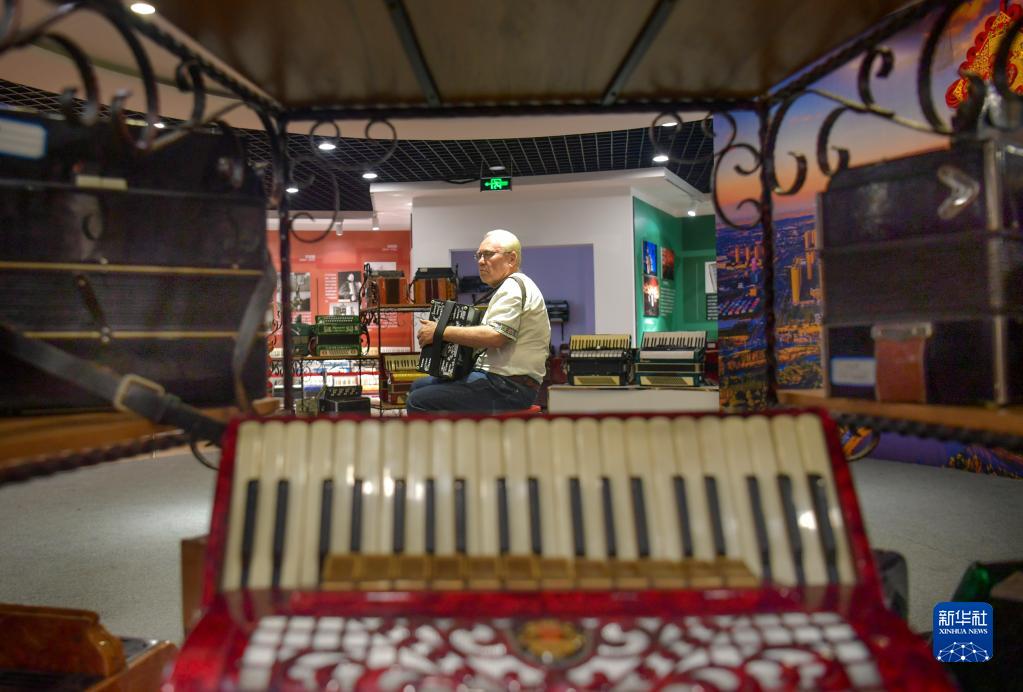 5月18日,在位于伊寧市六星街的亞歷山大手風琴珍藏館,一位樂手在為游客表演。