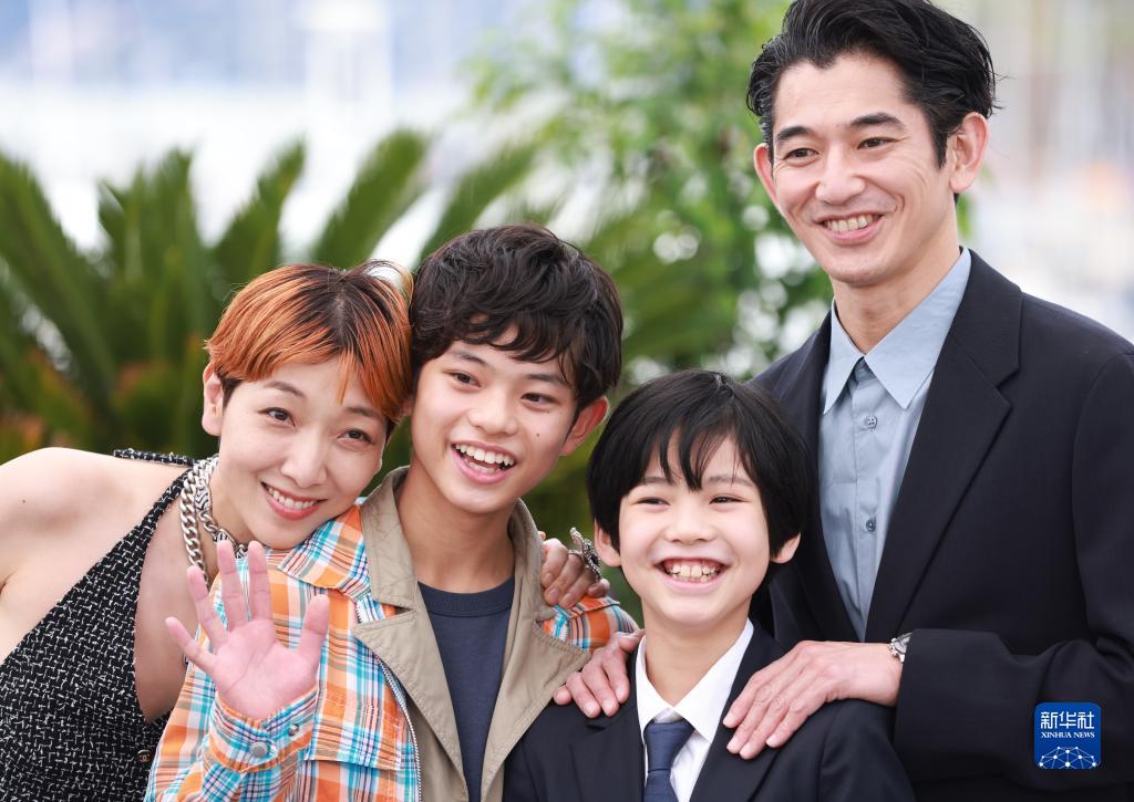 5月18日,在法國戛納舉行的第76屆戛納國際電影節上,日本演員安藤櫻、黑川想矢、柊木陽太和永山瑛太(從左至右)亮相影片《怪物》的拍照式。