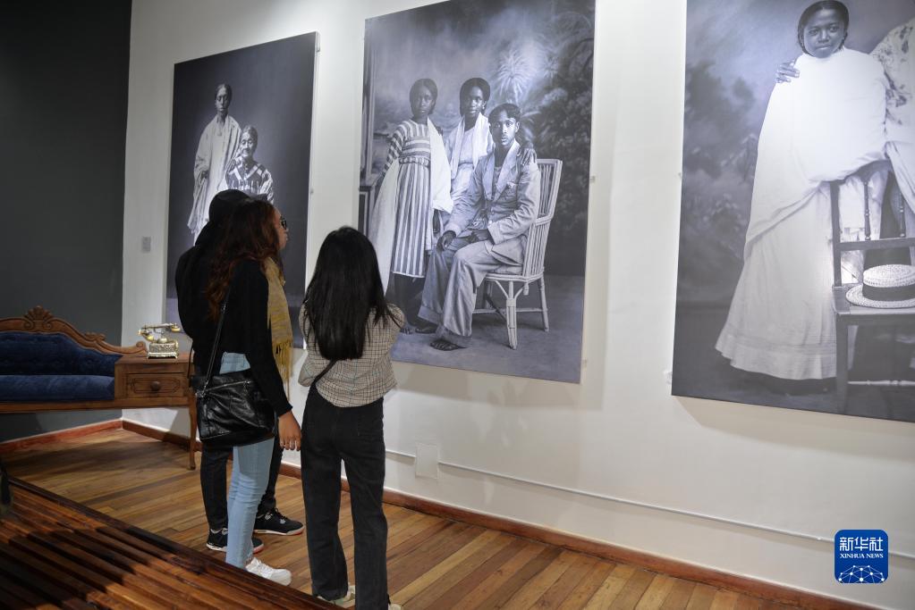 5月18日,在位于馬達加斯加首都塔那那利佛的照片博物館,當?shù)貙W生參觀馬達加斯加傳統(tǒng)服飾圖片展。