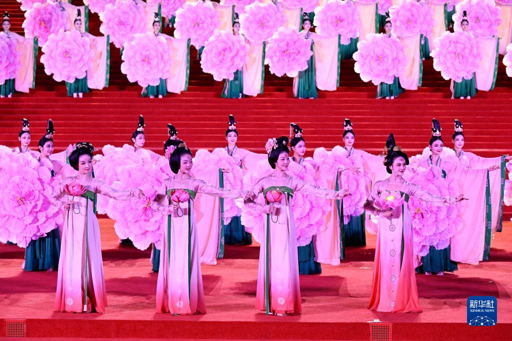 5月18日晚,出席中國-中亞峰會的中亞國家元首夫婦陸續抵達陜西省西安市大唐芙蓉園,參加在這里舉行的歡迎儀式。這是演員在歡迎儀式上表演。新華社記者 申宏 攝