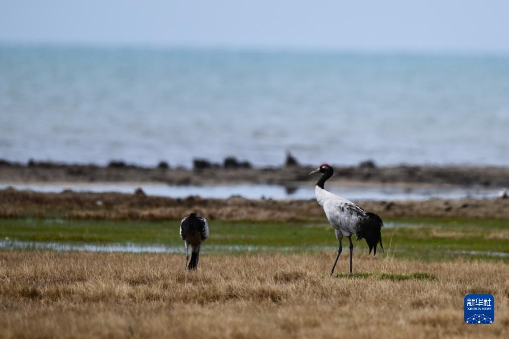 這是5月17日在青海省海北藏族自治州剛察縣境內的青海湖仙女灣景區拍攝的黑頸鶴。