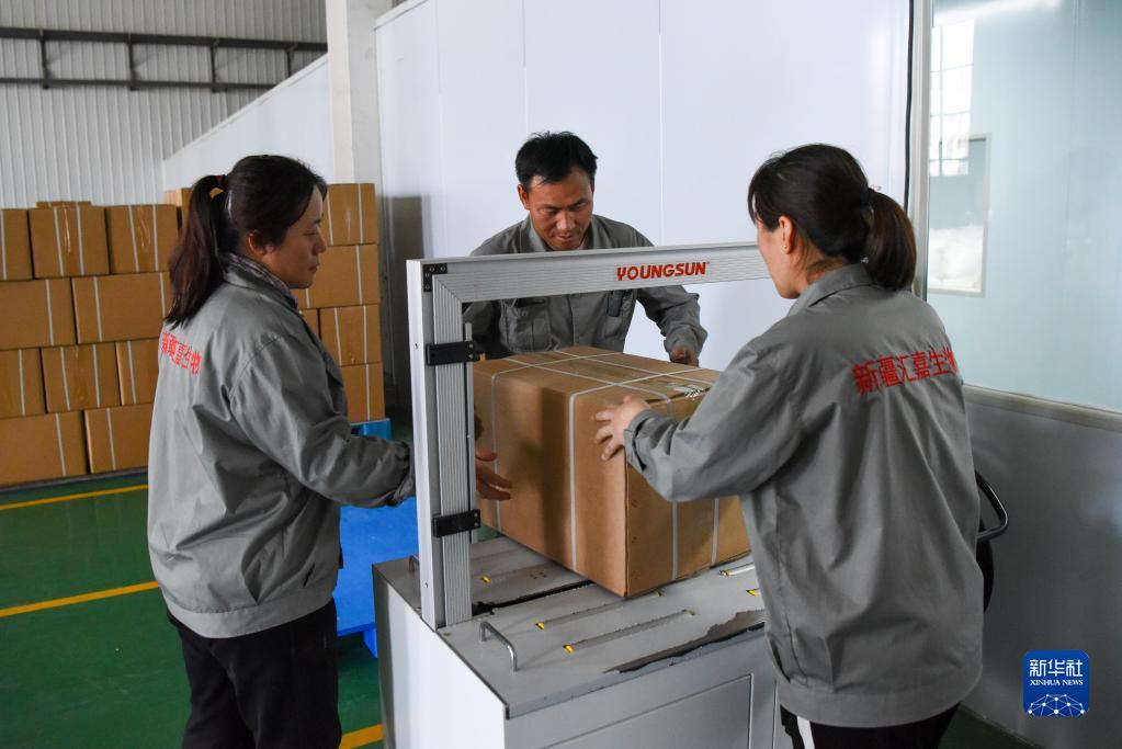 工作人員在位于新疆伊犁哈薩克自治州的新疆匯嘉生物科技有限公司生產(chǎn)車間包裝甜葉菊產(chǎn)品(5月17日攝)。