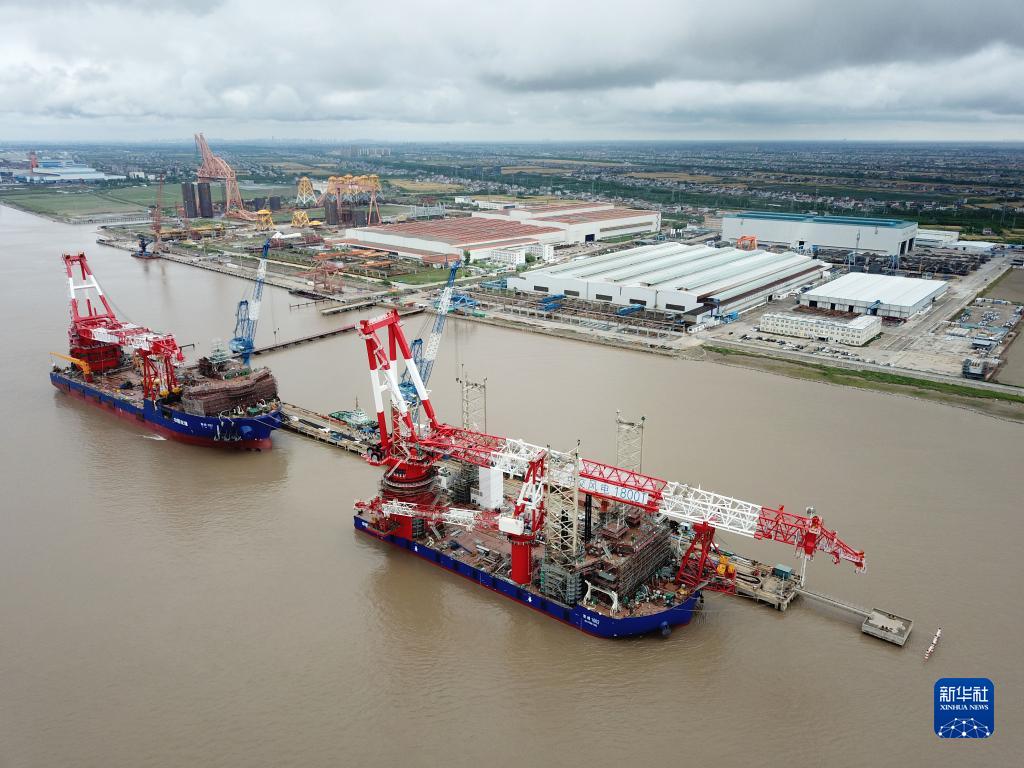 5月19日在江蘇省南通市啟東海工船舶工業園拍攝的上海振華重工啟東海洋工程股份有限公司,和該公司建設中的4000噸全回轉起重船(左)和1800噸風電安裝平臺(無人機照片)。