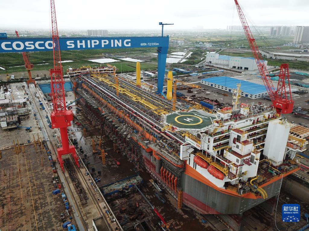 5月19日在江蘇省南通市啟東海工船舶工業園拍攝的,啟東中遠海運海洋工程有限公司正在建造的世界最大噸位級新型海上浮式生產儲卸油船(無人機照片)。