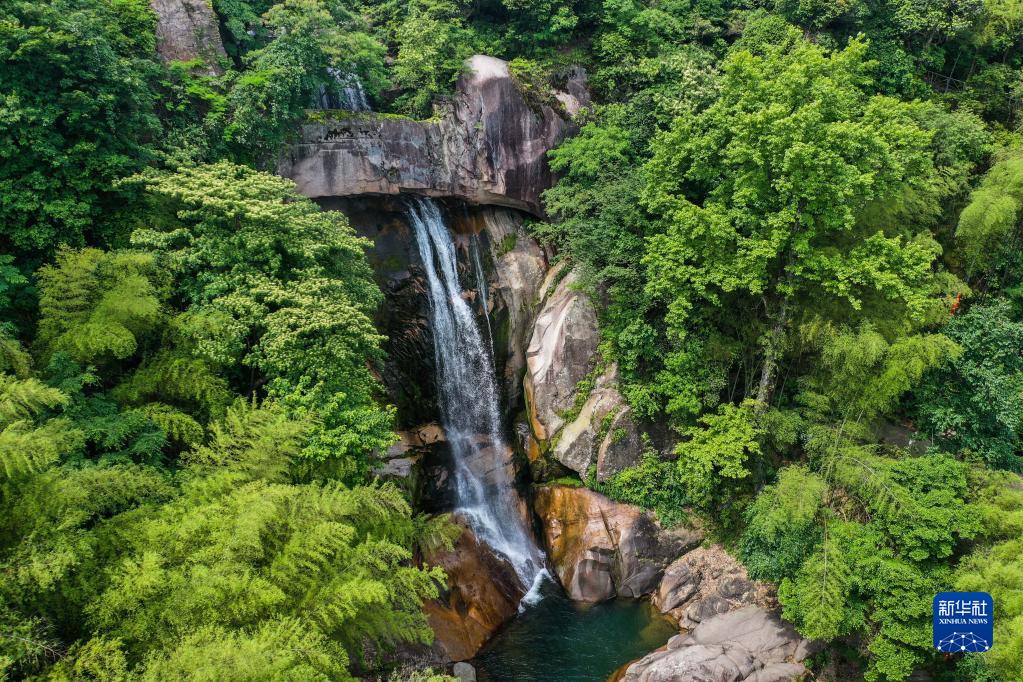 5月16日在浙江省臺州市天臺縣天臺山風景旅游區拍攝的石梁飛瀑一景(無人機照片)。石梁飛瀑景點有一條巨大石梁橫跨在兩崖之間,瀑布水流從梁底穿過,墜入幽谷之中。徐霞客在游記中寫道:“下瞰深潭,毛骨俱悚?!?/p>