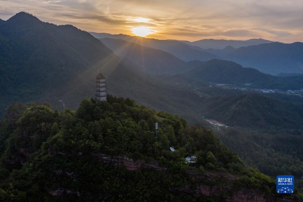 5月16日,在浙江省臺州市天臺縣,清晨的陽光照在赤城山頂的梁妃塔上(無人機照片)。