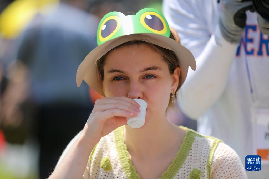 5月19日,游客在韓國首爾廣場品嘗中國茶。