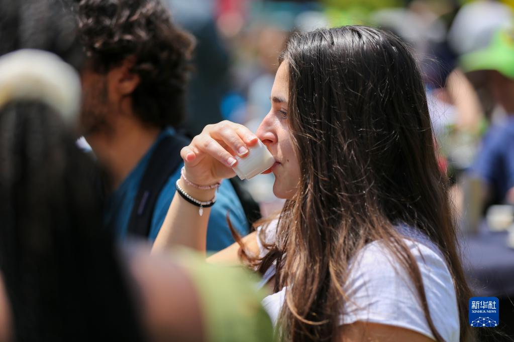 5月19日,游客在韓國首爾廣場品嘗中國茶。