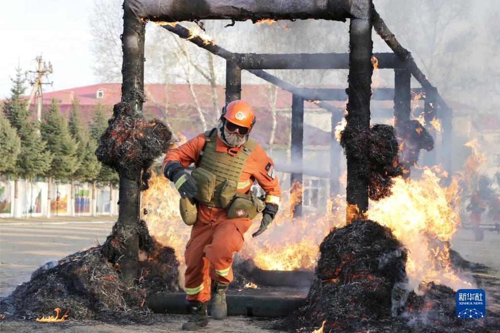 5月17日,在黑龍江呼瑪縣,大興安嶺地區森林消防支隊二大隊指戰員進行穿越火廊訓練。