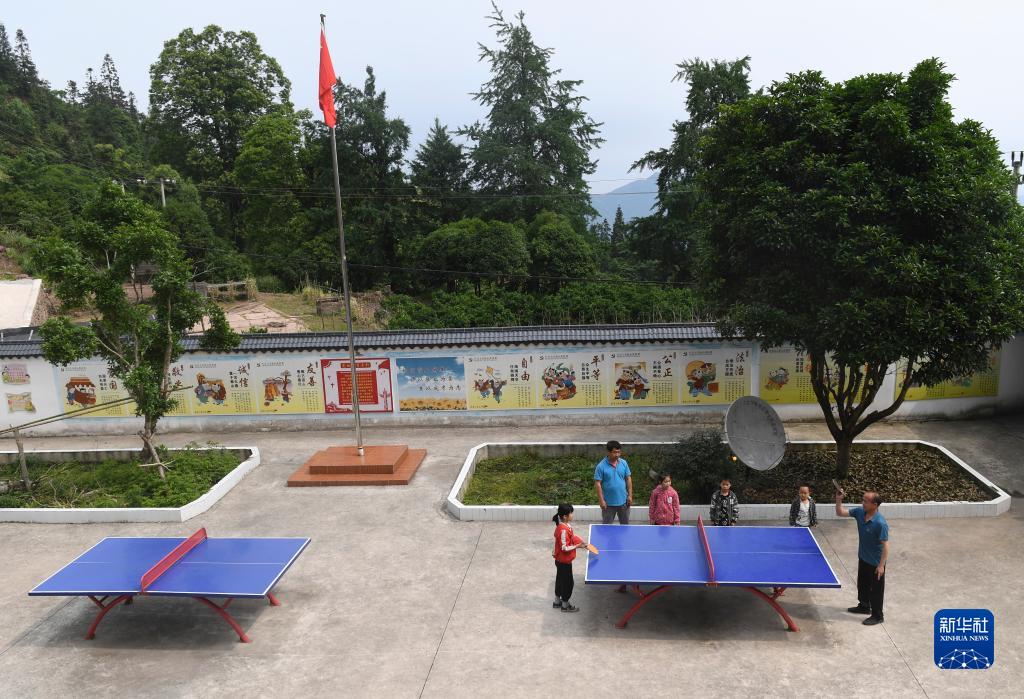 5月19日,在廣西靈川縣大境瑤族鄉金竹教學點,學校老師和學生一起打乒乓球。