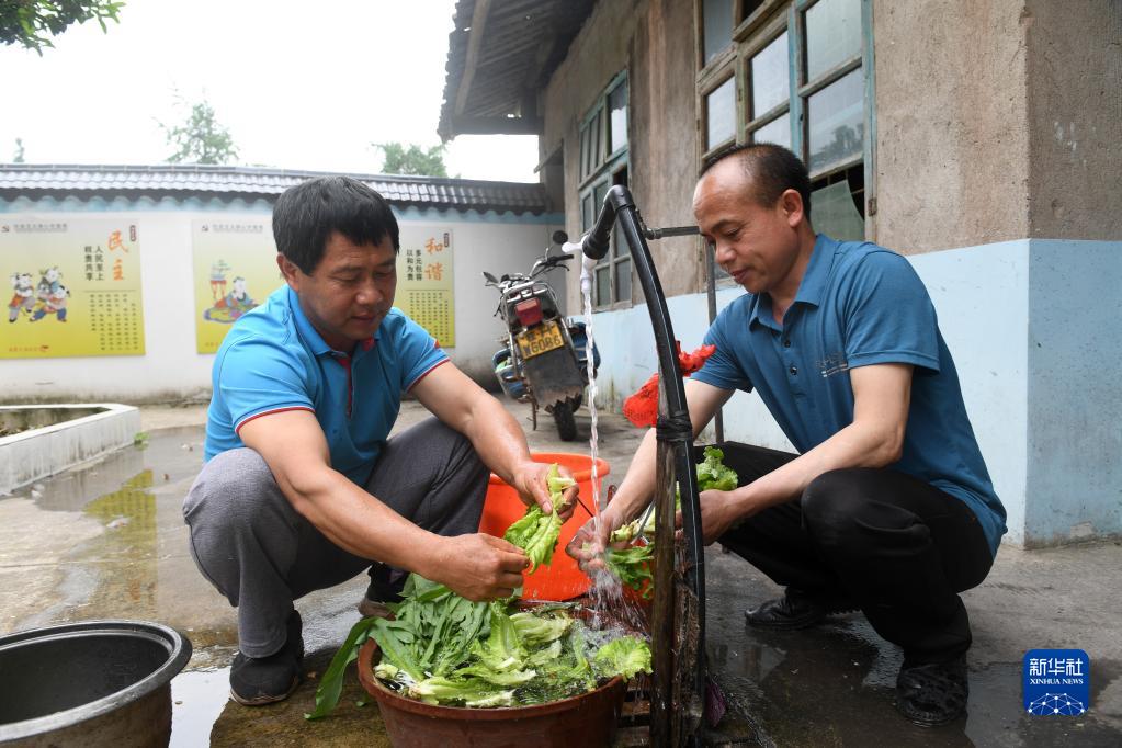 5月19日,在廣西靈川縣大境瑤族鄉(xiāng)金竹教學點,秦振林(左)和李忠華在洗菜準備做午飯。