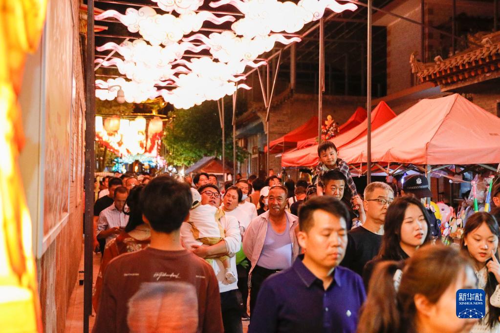 5月19日,游客在河口古鎮“黃河燈展”游覽。