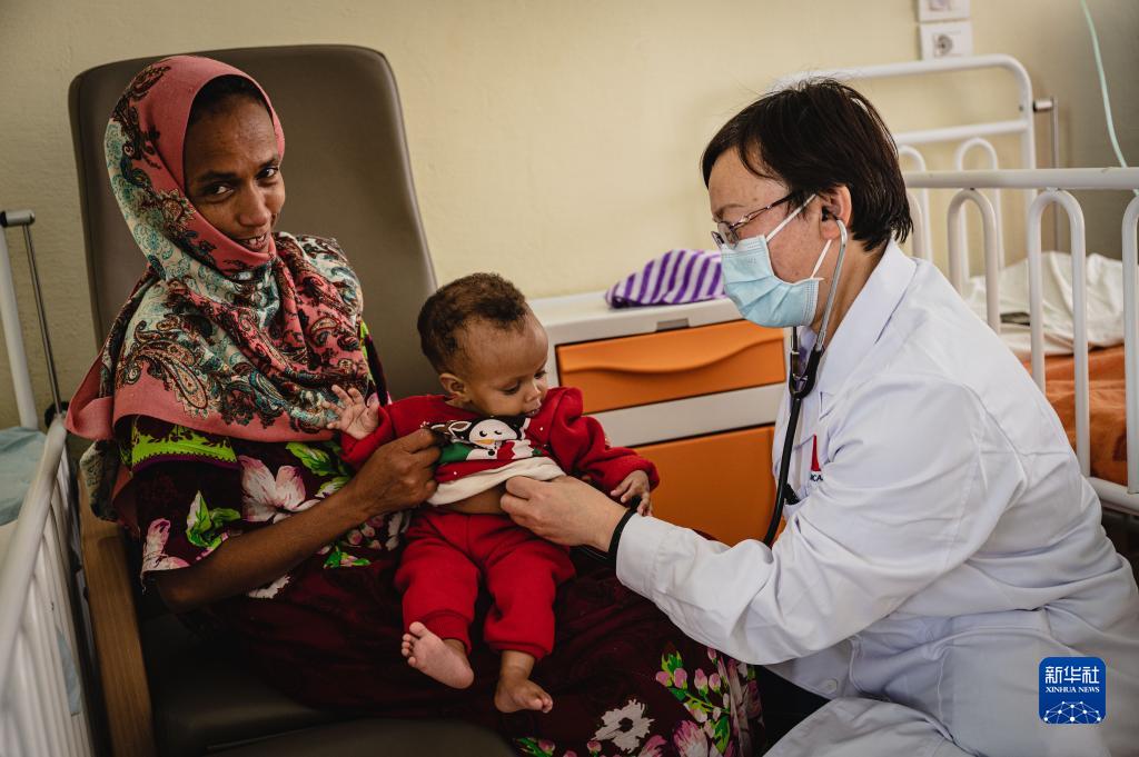 5月9日,在厄立特里亞首都阿斯馬拉的奧羅特醫院,醫療隊兒科醫生張春燕(右)為小朋友聽診。