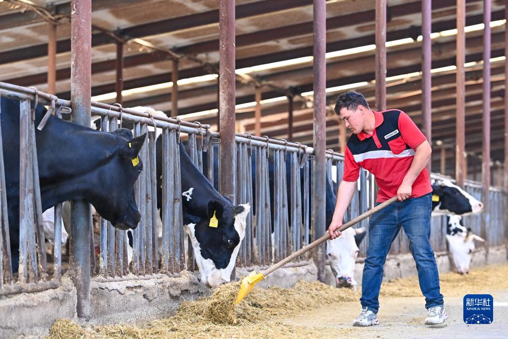 在新疆伊寧市巴彥岱鎮(zhèn)奶牛養(yǎng)殖場(chǎng),工人在打掃牛舍(5月19日攝)。